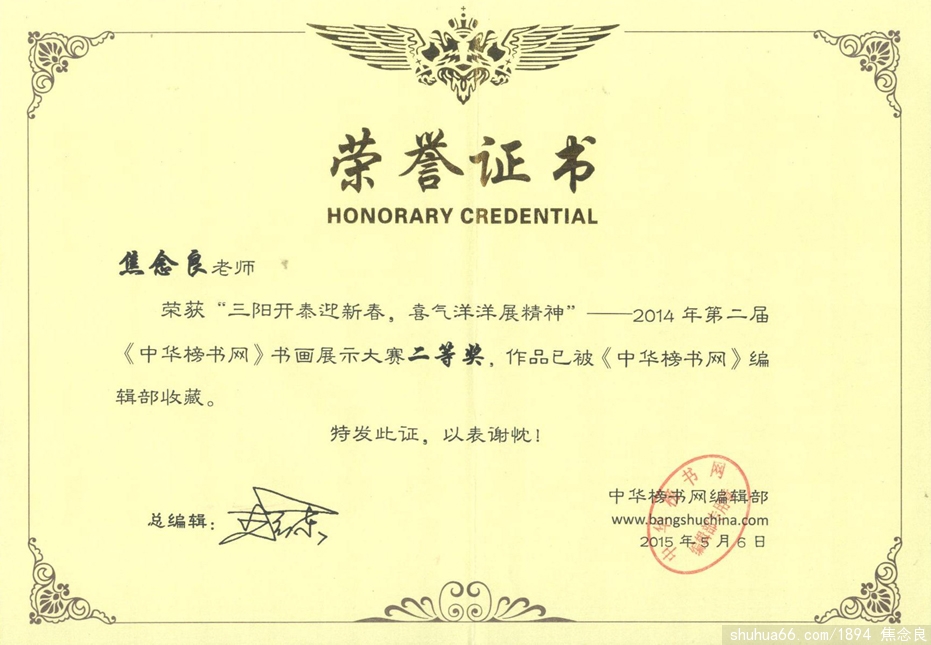 (焦念良在第一届《中华榜书网》书画展示大赛第三名二等奖)