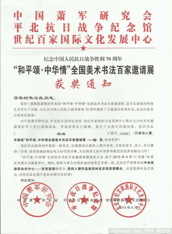 2、 焦念良和张书凤夫妻两人同届荣获“和平颂.中华情”全国美术书法百家邀请展一等奖。