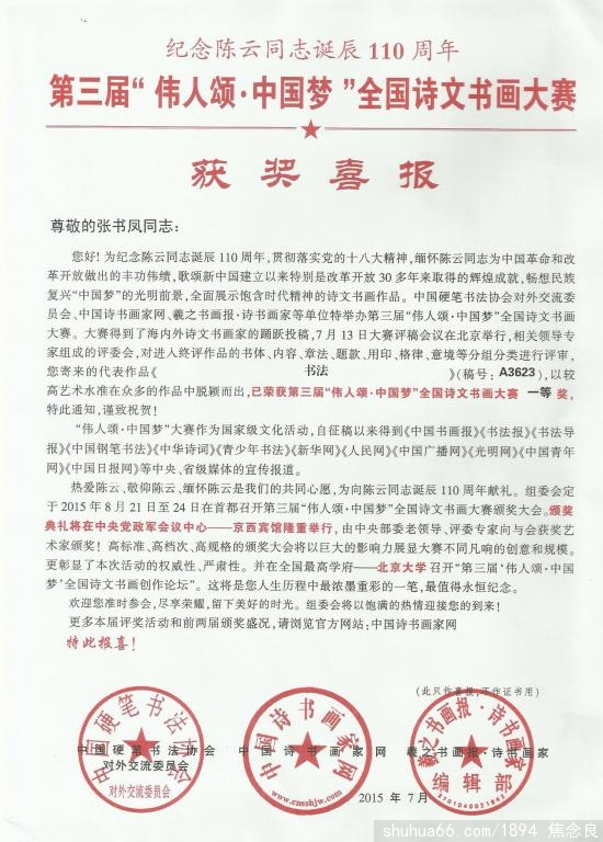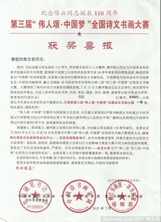 3、 焦念良和张书凤夫妻两人同届荣获第三届“伟人颂·中国梦”全国诗文书画大赛一等奖。