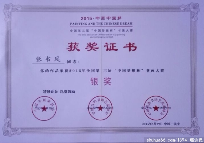 张书凤荣获全国第三届“中国梦想杯”书画大赛银奖