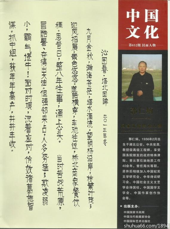 我的好朋友、尊敬的大哥郭仁炳先生1936年出生、是中国国学文学会会员、中国作家创作协会会员、新华艺术网执行副主席、中国著名诗词家、享受国务院特殊津贴。郭仁炳大哥出版了《油郎春秋》和《中国文化》诗词专辑、为我的的焦体书法做了六首诗、并赠送了这珍贵的书刊做为好友收藏留念。昨天、又为我全家新做了一首诗: