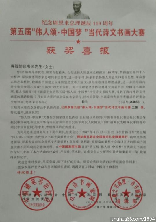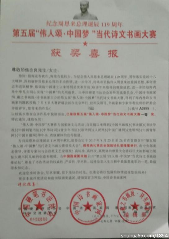 今天2017年8月9日收到,》第五届“伟人颂、中国梦”当代诗文书画大赛邀请展组委会的获奖文件, 焦念良和夫人张书凤及独生爱女焦芳分别荣获一等奖、二等奖和三等奖。被书画界誉为获奖专业户。