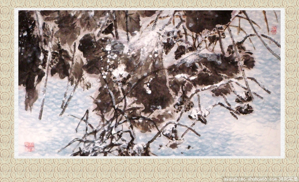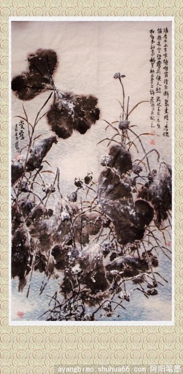 : 荷花遇到雪,等于遇到六月雪。什么事?比窦娥还冤吗?画些雨中荷试试,效果会比这好。