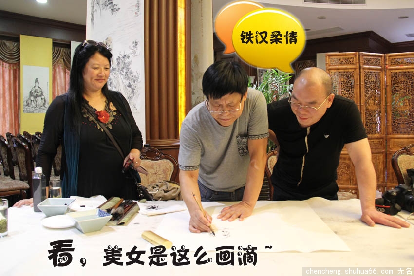 美女画家赵胜东老师戴了一副眼镜,粗犷的北方汉子,多了几分才子的孺雅。此刻,正瞅着画面上的一尊弥勒佛,右手捏着一支毛笔,调墨设色,物我两忘,相看两不厌,两个乐天派。