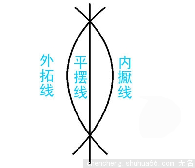 “内擫”与“外拓”的提出,首见于元代袁裒的《书学纂要总论书家》:“右军用笔内擫而收敛,故森严而有法度;大令用笔外拓而开廓,故散朗而多姿”。虽然这是对于大王与小王在风格及审美范畴上的对比评价,但我们应该注意这里的“用笔”二字。袁裒认识到这种在风格上的差异,来源于用笔的不同,如果说“森严而有法度”与“散朗而多姿”是针对结体而言,“收敛”和“开廓”很明显是指线条本身的差异。明代丰坊《书决》云:“右军用笔内擫,正锋居多,故法度森严而入神;子敬用笔外拓,侧锋居多,故精神散朗而入妙”。很容易看出,这种说法渊源于袁裒,且在丰坊的本来意思中,与袁裒没有什么差别,是袁裒说的进一步解释。丰坊认为袁裒所谓的内擫与外拓是造成正锋和侧锋的原因所在,他把这种观点落实在书写者的腕部。认为用笔在以腕为轴的小范围内,能做到正锋;而展开腕部的回旋,则有一些笔画(主要在右侧)会出现侧锋用笔的现象,把内擫与外拓归结到因笔势不同而造成线条立体构成的差异上,应该讲,是在前人基础上的发展。康有为《广艺舟双楫缀法第二十一》云:“书法之妙,全在运笔。该举其要,尽于方圆……方用顿笔,圆用提笔;提笔中含,顿笔外拓;中含者浑劲,外拓者雄强;中含者篆法也,外拓者隶法也”。康氏对笔法的分类,较为细致,也看到了线条的实质。他认为书法线条有方圆两种。落实到技法上,用顿笔作方,用提笔作圆,但说的较为含糊,在实践中觉得还不够到位。“提笔中含,顿笔外拓,中含者浑劲,外拓者雄强”说得更是含糊,但下一句“中含者篆法也,外拓者隶法也”,道出了书法线条方圆用笔的精髓所在。在线条上篆的圆浑与隶的平展存在着较大的差异。若《石门颂》,全然篆法,而《张迁》《乙瑛》《华山》便以隶法方笔为主,杂以篆法圆笔。康有为在这里至少说出了线条有方圆(隶篆)两种,至于如何把这两种线条表现出来,还是没有交代(康氏自己却是常以篆法作字)。沈尹默则认为“内擫是骨(骨气)胜之书,外拓是筋(筋力)胜之书”,沈老把内擫与外拓和字的筋骨血肉,也即线条的实质构成结合起来,说明他发现了内擫与外拓的用笔方法,对字的筋骨——即线条的实质构成有较大的影响,但局限在于,还只是仅仅立足于鉴赏,没有触及笔法实质。综上诸家,其历史局限限性均在于没有深入到线条的实质中去,用物理的方法,物质的观点去分析书法线条的构成方式。没有深入对毛笔的各个部分进行更细致入微的分析梳理,从而总结出更加准确,让人信服的用笔方法,即如何用好毛笔,用毛笔写出质感各异的书法线条,包括写出“内擫”与“外拓”。