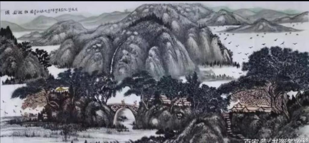 如在作品中远天灰蒙,几座苍劲古拙造型生动的大山矗立在半空中,苍翠幽壑、云雾萦绕,两侧对峙的山峰起伏不断。山腰处若隐若现的飞檐翘角的房舍,也许那就是钓者沽酒的人家。画家如此巧妙的安排,追求的就是一种心灵的安宁一种灵魂本真的回归。然而山涧灵巧清丽自由飞翔的几只珍鸟,又为画面增添了非凡气势,大有蓬莱之境令人心驰神往。在这幅作品中先生动静结合,远山雄浑壮阔,近景润泽清新,让人领悟自然本真的同时更有物我一体的精神境界。