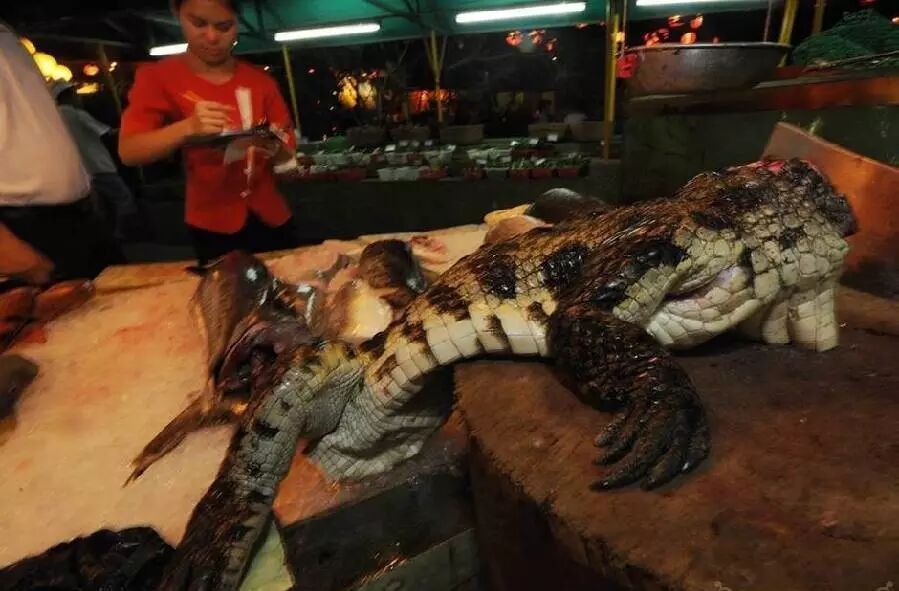海南板桥市场,一只无头鳄鱼被放置在砧板上