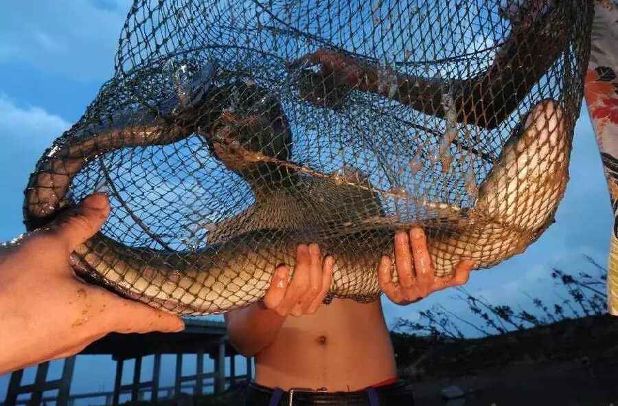 海南海口,南渡江的渔民捕捉花鳗鲡