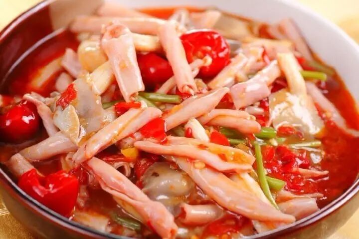 脆鹅肠:选取肥美的活鹅,拿小刀沿着鹅的肛门划一圈,再把食指插入鹅的肛门内,然后旋转,再用力向外拔出。这样一来就可以取到最新鲜的鹅肠了,但是鹅受到的痛苦实在是……