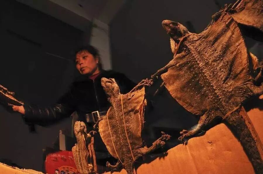 河南禹州中药材集散地,一只只晒干了的中华大壁虎,它们被整齐悬挂在一家中药店最显著的位置