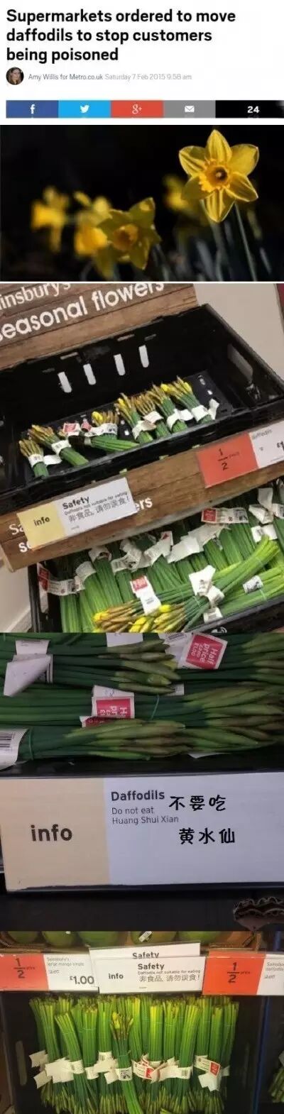 知乎有个帖子:“老太婆偷割了我院子里的洋水仙给她孙子吃,然后她孙子中毒了,老闹事要求赔偿,我是否应该赔偿?”几天之内引来答案逾千,还有数百条评论,多家网络及纸媒转载。群众虽讨论的多关于如何对待刁蛮老太,但知乎页面却细心地配了相关文章链接,《为防止中国留学生误食黄水仙中毒 英超市禁止将其摆蔬菜附近》,便于拓展阅读。两件事放在一起“拓展”,除了洋(黄)水仙不能吃是一个共同主题,另一个可以算国人对食物的热爱超乎寻常、不放过任何一个机会。