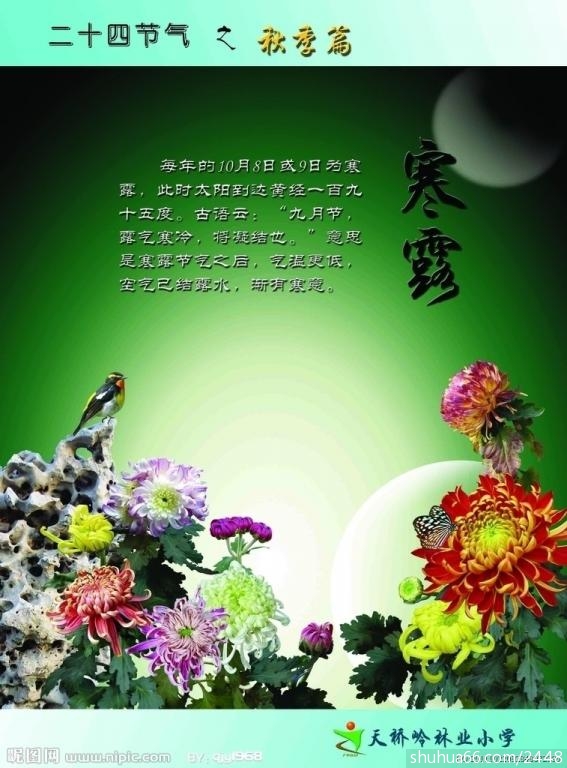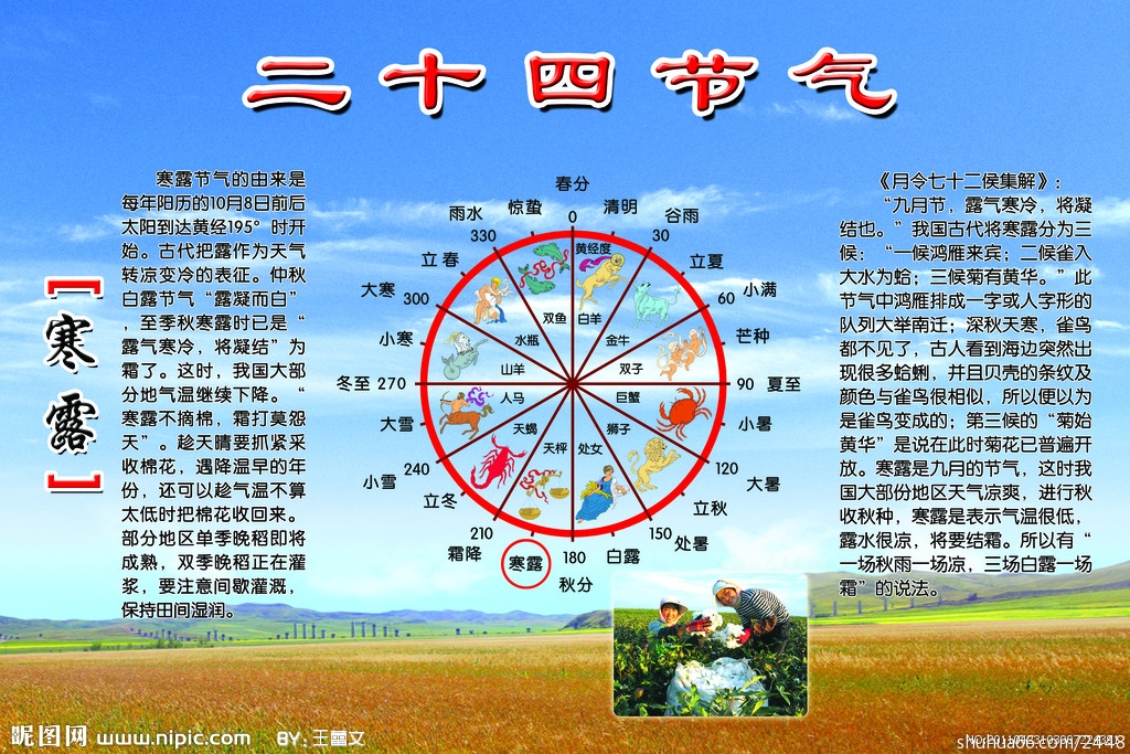 寒露是农历二十四节气中的第十七个节气,属于秋季的第五个节气,表示秋季时节的正式开始;时间在公历每年10月7日~9日。视太阳到达黄经195°时。《月令七十二候集解》说:“九月节,露气寒冷,将凝结也。”寒露的意思是气温比白露时更低,地面的露水更冷,快要凝结成霜了。寒露时节,南岭及以北的广大地区均已进入秋季,东北进入深秋,西北地区已进入或即将进入冬季。气温逐渐下降。白露、寒露、霜降三个节气,都表示水汽凝结现象,而寒露是气候从凉爽到寒冷的过渡。夜晚,仰望星空,你会发现星空换季,代表盛夏的“大火星”(天蝎座的心宿二星)已西沉。我们可以隐约听到冬天的脚步声了。