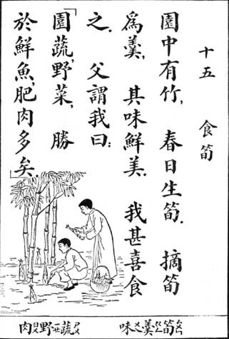 课文选:食笋 园中有竹,春日生笋。摘笋为羹,其味鲜美,我甚喜食之。父谓我曰:“园蔬,野菜,胜于鲜鱼,肥肉多矣。” 父子居家情景对话,一语清新,盈盈可握,如雨后笋芽。生活亦俗亦雅,雅如苏东坡,俗如东坡肉。有民谣称:住无竹而俗,食无肉而瘦,若要不俗也不瘦,竹笋炖猪肉。常被喻为新生事物的雨后春笋,鲜嫩嫩、脆生生,可佐餐时代。
