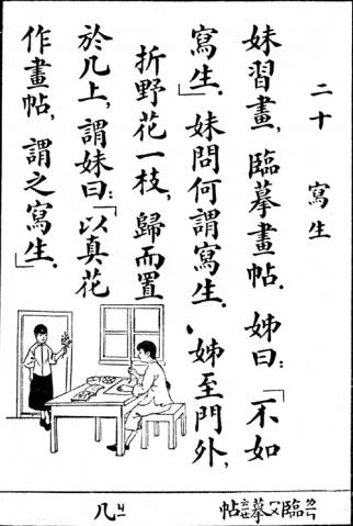 课文选:写生 妹习画,临摹画帖。姊曰:“不如写生。”妹问何谓写生。姊至门外,折野花一枝,归而置于几上,谓妹曰:“以真花作画帖,谓之写生。” 画中人,人中画;野花一枝,姐妹俩儿。写生生机勃勃,绘画画里乾坤。李叔同曾作歌曲《春游》:“春风吹面薄于纱,春人装束淡于画。游春人在画中行,万花飞舞春人下。梨花淡白菜花黄,柳花委地荠花香。莺啼陌上人归去,花外疏钟送夕阳。”花儿是姐妹的画帖,姐妹是天地的画帖。