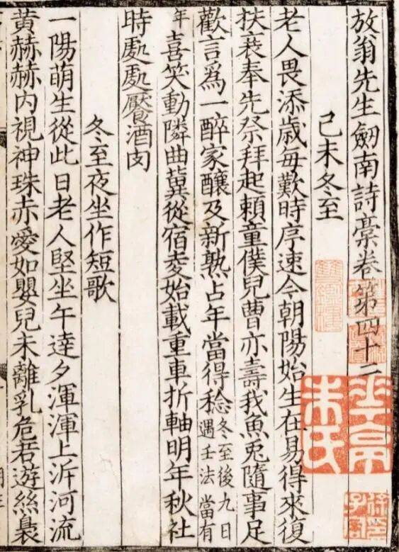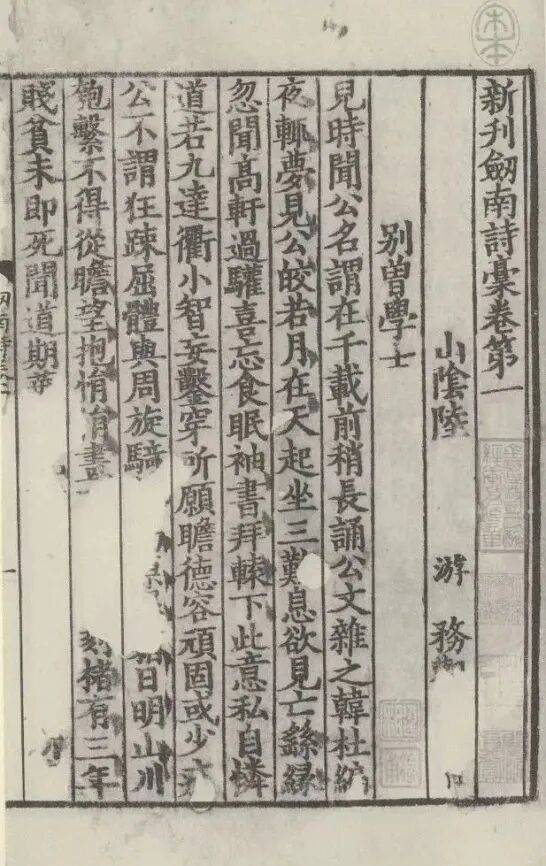 《新刊剑南诗稿》二十卷宋淳熙十四年(1187)严州郡斋刻本国家图书馆藏