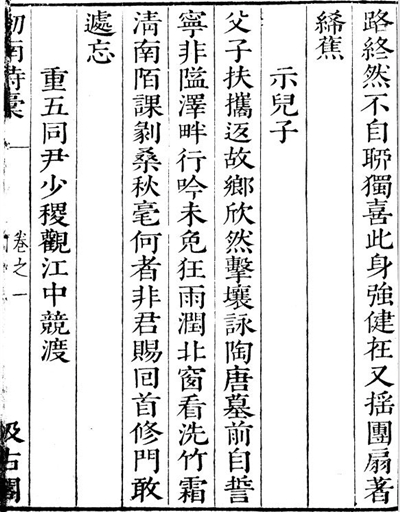 《示子虡》:好学承家夙所奇,蠹编残简共娱嬉。一婚倘毕吾无累,【自注:吾今年为一子自蜀归者聘妇,无复婚嫁之责。】三釜虽微汝有期。【自注:子虡明秋当赴句金】聿弟元知是难弟,德儿稍长岂常儿。要令舟过三山者,弦诵常闻夜艾时。(《剑南诗稿》卷四十八)