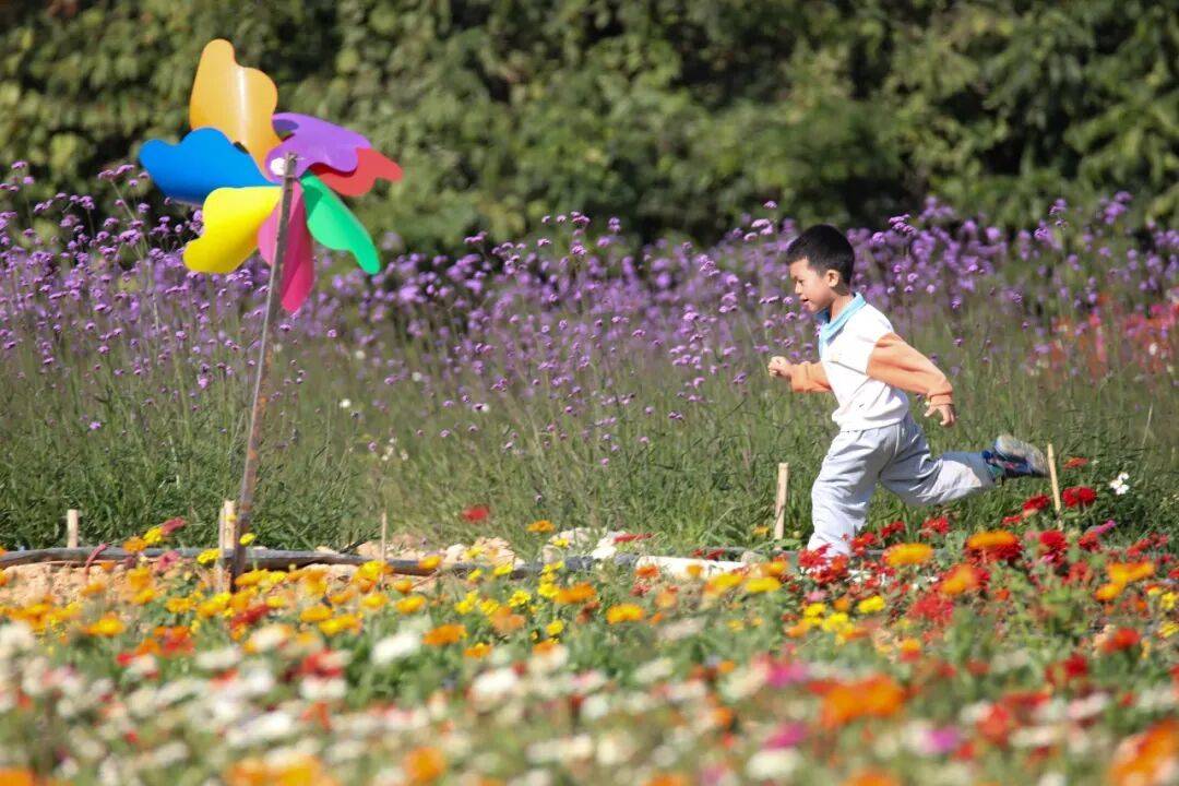 1月11日,小朋友在云南省景洪市工业园区管委会曼沙村的花海里奔跑玩耍。新华社发