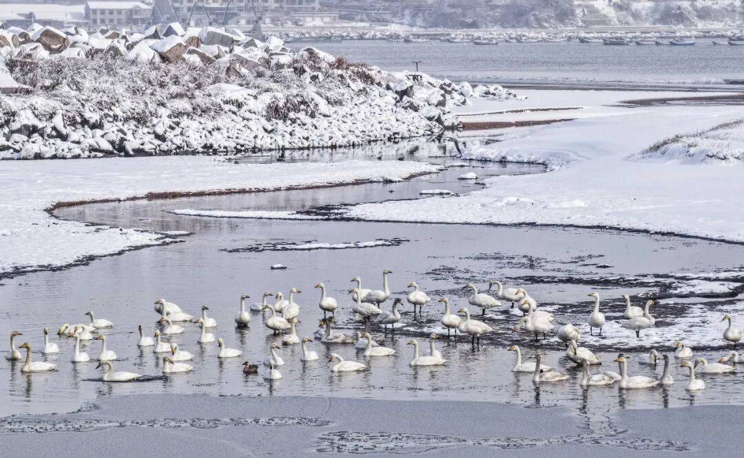 1月11日,大天鹅在山东省荣成市爱伦湾栖息、游弋、觅食。新华社发