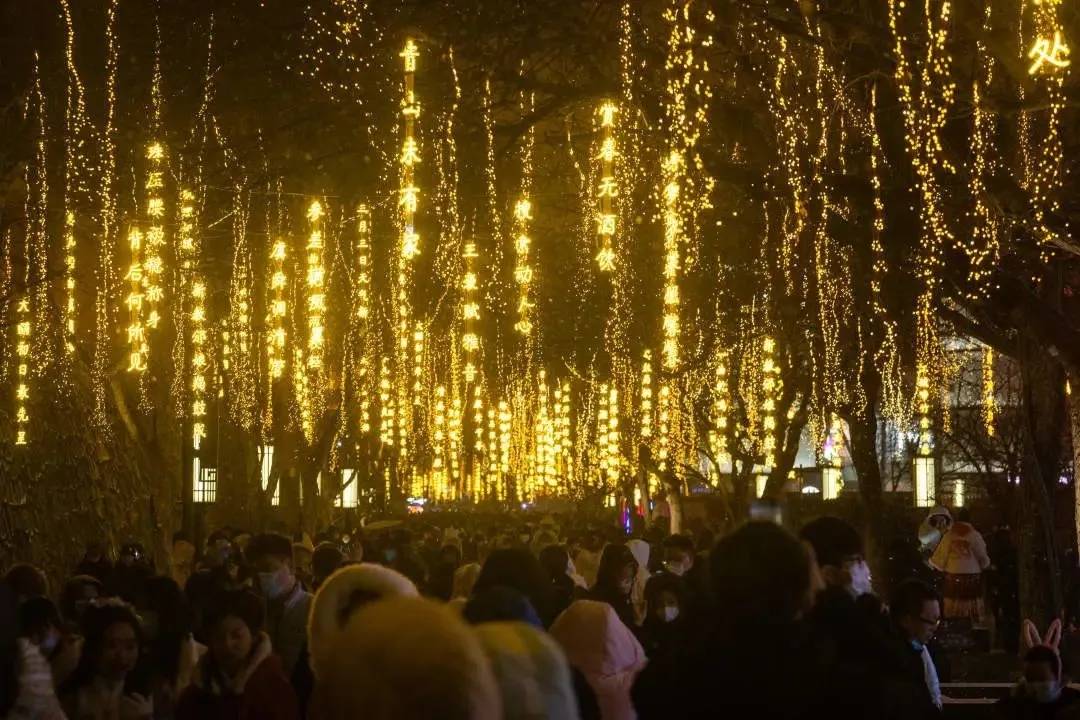 沿着不夜城的灯火前行,在大雁塔脚下,一条“古诗词路”悄然点亮了夜空。数十首唐代名句以彩灯形式悬挂于树梢,形成璀璨的“诗词星河”,将千年前的文字凝成可触的光影。街上的游客时而驻足仰望,时而举起手机拍摄,将“诗意长安”的记忆久久留住。