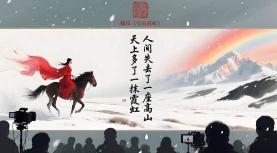 《雪山霞虹》以边疆风雪为底色,每一句诗行都与贺娇龙的实干人生相映。“红衣穿过戈壁的凛冽长风”,恰是她身披红斗篷策马雪原的生动写照,象征着她不畏艰难、扎根昭苏的坚毅;“马蹄踏醒山海”暗合她以数字技术为“蹄”,踏破牧区闭塞、助农增收的开拓之举。“昭苏的雪/落了两日未停”以景衬情,隐喻着人们无尽的悲痛;“人间失去了一座高山/天上多了一抹霞虹”是全诗灵魂,“高山”喻指她47载人生路中448场公益带货、6 亿元销售额的实干伟绩,“霞虹”则将她“流量为民”的初心升华为永恒指引。结尾“心中装着百姓的人/永远活在百姓心中”,是对这位人民公仆最高的礼赞。