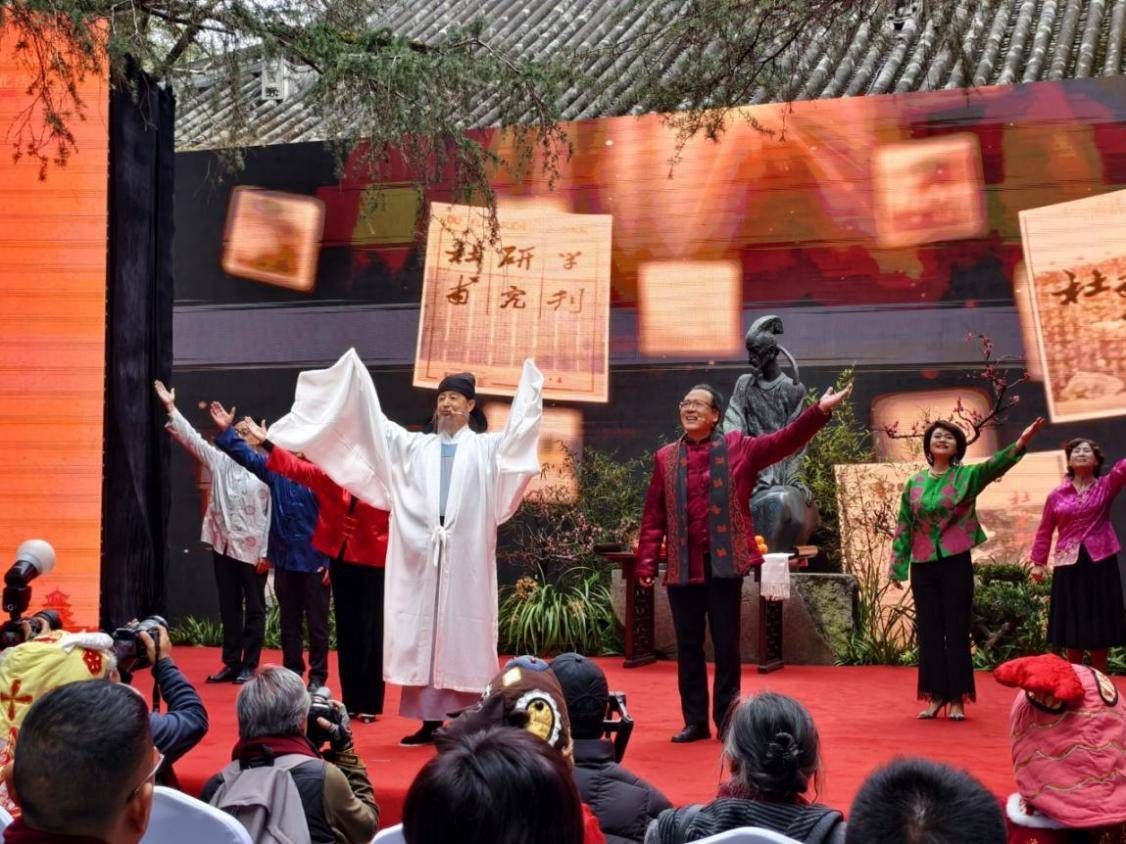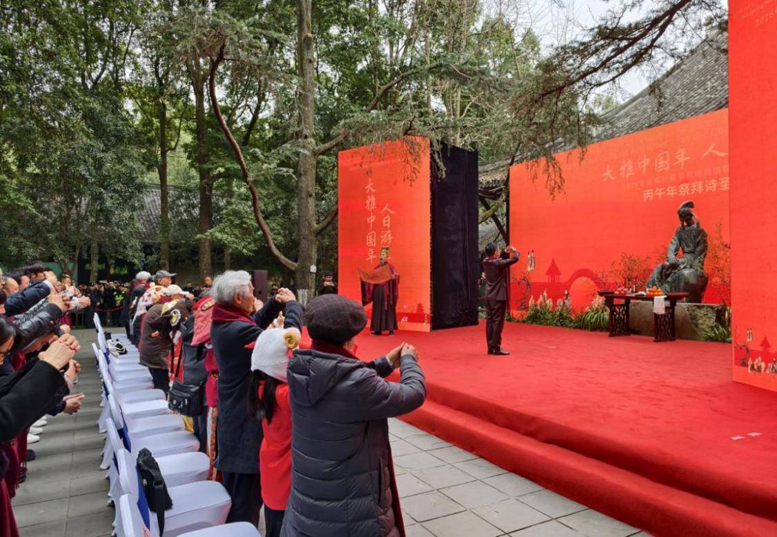 上午10时,丙午马年人日祭拜仪式正式启幕。大雅堂前,古乐悠扬,仪式严格遵循传统礼序。在司仪庄重深情的介绍中,现场嘉宾与观众重温了“人日”祭杜的历史渊源——这不仅是对一位伟大诗人的追思,更是对中华民族诗歌基因的年度唤醒。