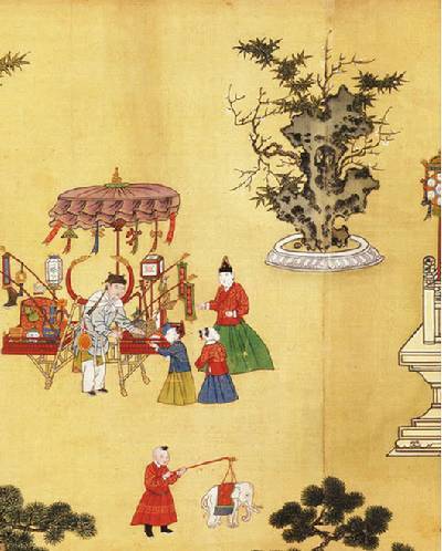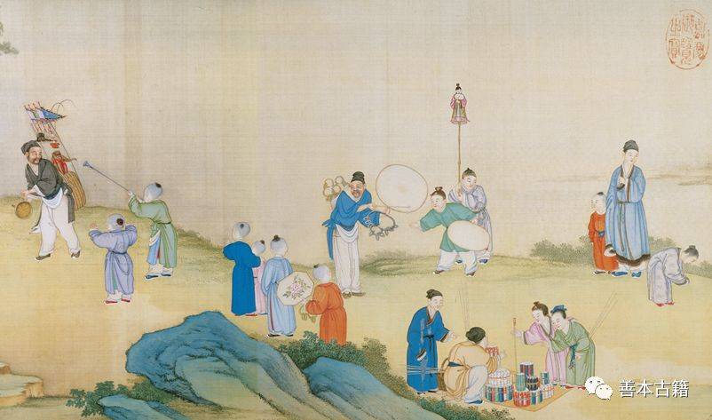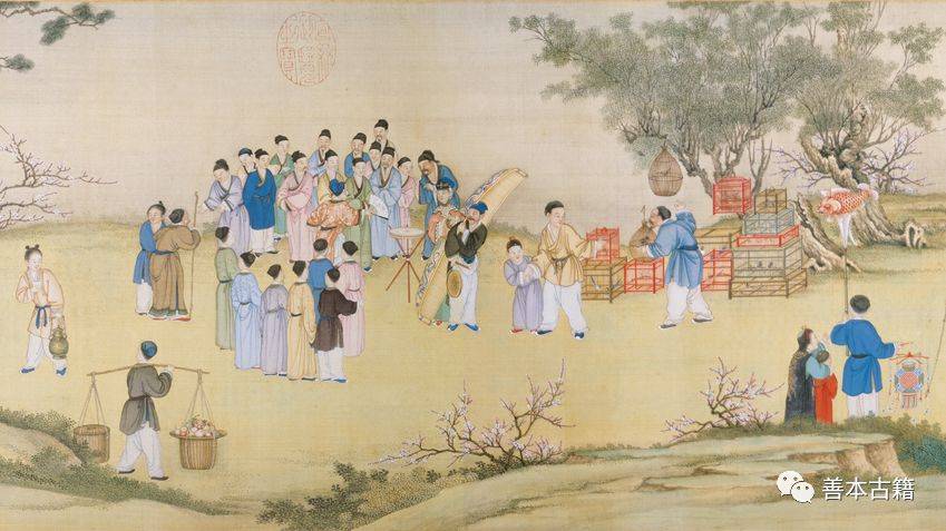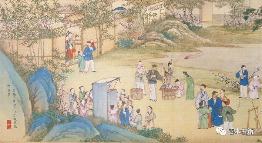 此卷描绘新春农村热闹欢庆春节情景,爆竹、太平鼓、果品、鸟鱼挑摊,以及各种行业的耍猴货郎、算命、跑旱船、演傀儡戏的表演艺人。松树下文士席坐品茶閒聊,朱漆托盘内置有紫砂大壶与青花碗,盛装泉水则用绿地花卉大壶、茶铫。挑夫担子盛放糕点使用的是青花与描红龙纹碗、盘,均是乾隆时期宫廷用器,可知街上买卖艺人都是由宫中侍僕所装扮。