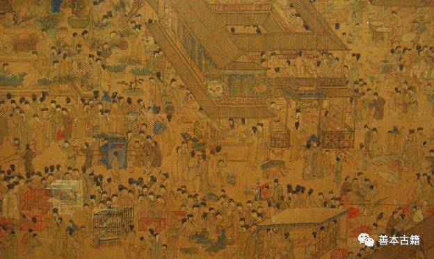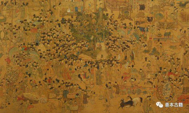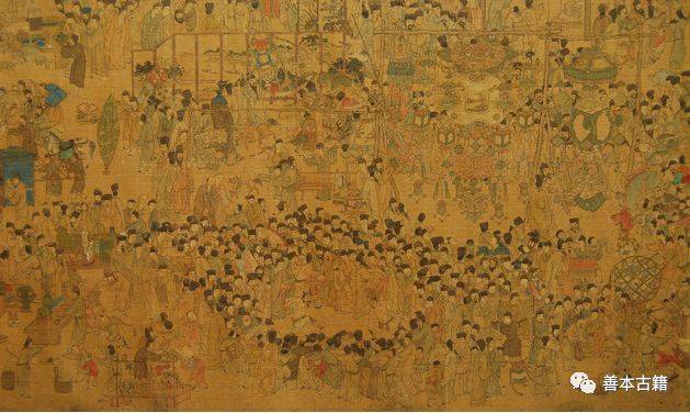 随着历代元宵灯会的发展,灯节时间也越来越长。唐代灯会是“上元前后各一日”,宋代又在十六之后加了两日,明代则延长到由初八到十八,整整十天。此画描绘的是明代南京三山街一带元宵节盛况。所画地点应是金陵“秦淮河往北过三山街的内桥一带”。从全景内容来看,画家描绘的正是一次元宵灯市与古董贸易相结合的集市活动。
