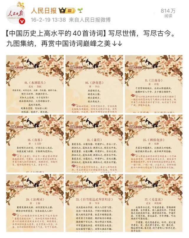 人民日报微博曾发文:“中国历史上高水平的 40 首诗词,写尽世情,写尽古今。九图集纳,再赏中国诗词巅峰之美。”千年文脉,诗韵流芳,一字一句道尽人间悲欢。今天小编整理这份经典合集,与大家共赏中华诗词的极致魅力。从序号40到序号1,你都记得哪几首?