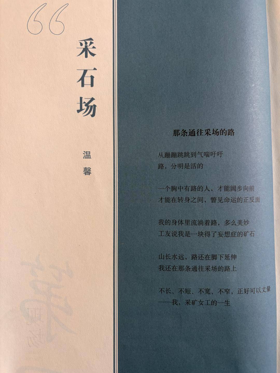 有一年,温馨被调到工会,做些文字工作、发发物资。干了一年,她主动申请回到采石场。“工会的事太琐碎了,虽然不累,但耗神,不利于写诗。回到生产一线,感觉更鲜活,写诗更有灵感。”