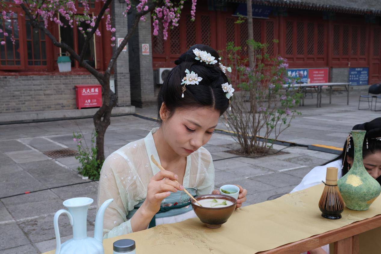 “今天我们为大家准备了桂花、丁香、沉香等天然香料,还有香泥与各式模具,大家可以亲手制作专属香牌。”繁星艺术村的桃子老师现场对记者介绍。一旁的宋式点茶技艺展演同样吸睛,点茶师以茶为墨、以盏为纸,指尖轻转间,一幅《千里江山图》缓缓跃然碗中,尽显传统茶艺的精妙。据点茶师介绍,从点茶到完成茶百戏,整个过程大约需要半个小时。