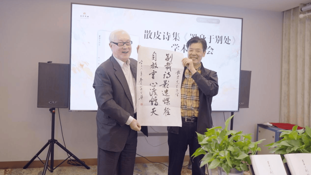 山东大学文学院教授、《文史哲》原资深编辑、《青年思想家》原主编贺立华致辞,对散皮多年扎根生活、关照内心、充满人文温度、兼具个人风格的诗歌创作,给予充分肯定,并向散皮赠送了亲自题写的书法作品,为研讨会送上真挚祝贺。