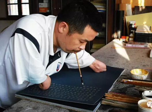 他,1970年出生,祖籍河南襄城,4岁时因触电失去双手。然而,他却凭着一腔热情和超人的毅力,成了一名书法家,中国书协会员。