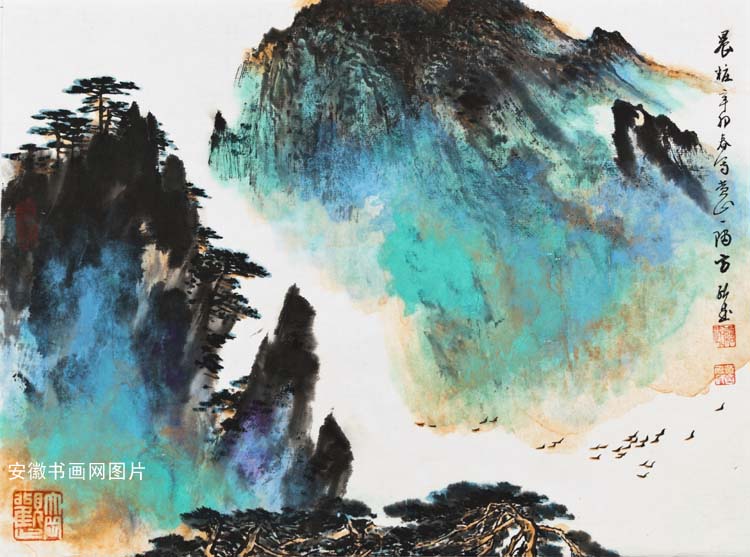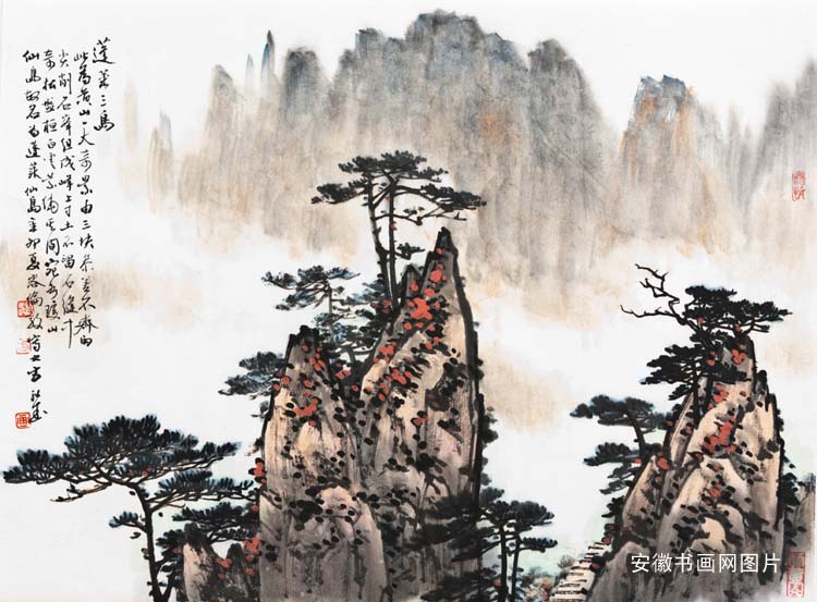 中国画主攻山水,在传统基础上力求创新,自辟蹊径,以书入画,书写黄山精神。