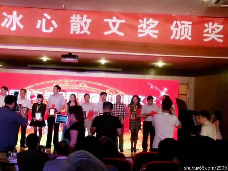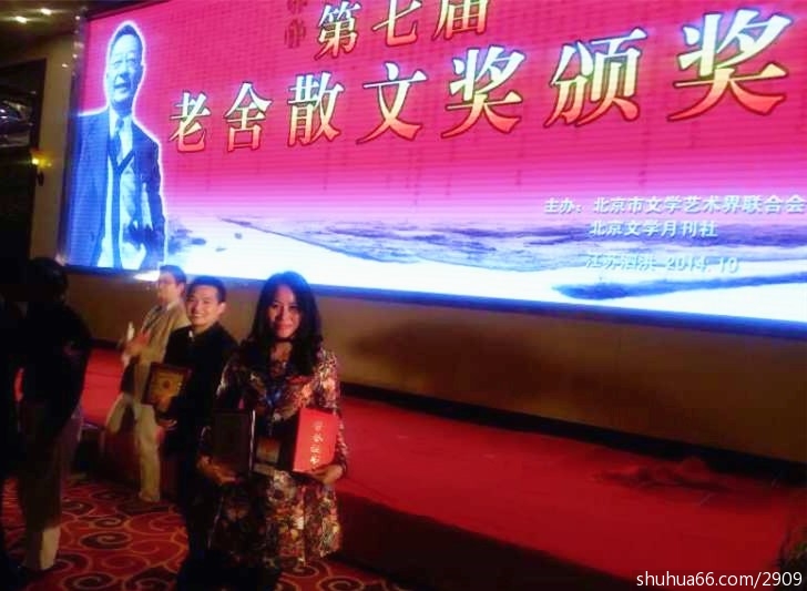 (图为陈婷筠在“老舍散文奖”领奖台上)