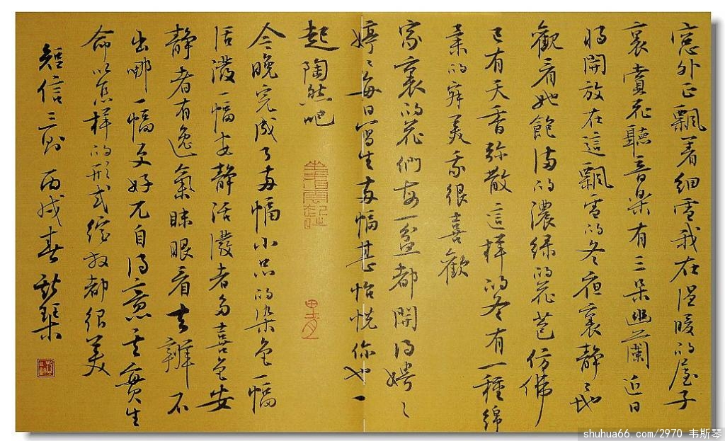 韦斯琴的书法不乏唐诗宋词的经典篇章,但她觉得毕竟不如写自己的文章惬意。至今已出版过三本散文集的韦斯琴,将散文中的细腻融入书法行云流水般的节奏和千变万化的色调里,感觉是如此的清逸舒畅。韦斯琴常常抄录自己的文字,而每次展读,昔日景象便在她脑海里重现,那些鲜活的美通过书法再传递给其他读者,韦斯琴觉得这是书法之外的另一种美。