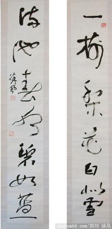 作品曾参加中国书画名家作品展,中国青少年书法精品赴港展,全国首届楹联展,世界华人书画展,1992.1993.1994三年连续在日本东京美术馆举办的第53.54.55回国际文化交流展上分别荣获金,银,铜牌大赏奖,作品被东京美术馆收藏。读徐风先生的书法,犹觉一阵清风扑面。日前,美国加州斯坦福大学汉学教授、美学迈克尼!看过此作品似有同感,坦言道:“徐风先生的书法一扫中国书坛几十年的沉闷空气。他以笔法流畅及很自然的变形手法”,创造出“极鲜明的个人风格”。徐先生书写的“春水碧如蓝,梨花白似雪”正好具备他强调的两大艺术特色。一是笔法流畅。而且根据章法的需要赋予它们以大小、轻重、肥瘦之别。其它字也力求变化,合理穿插。
