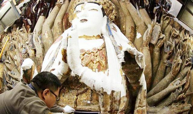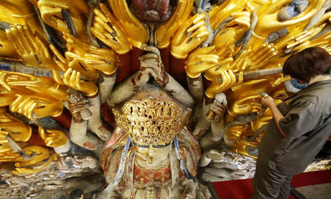 这项修复工作并不简单,直到2008年7月,政府出资的专家团队才开始了这项庞大的修复工程。在修复之前,专家们对佛像进行了近两年的检查,仔细探讨了观音像外部和内部的损坏情况。为了避免像兵马俑一样发生氧化,专家们特别注重佛像内部的保护。同时,他们还重新确认了千手观音的手的数量。通过现代技术,专家们发现,原先记录的1007只手是错误的,正确的数字应为830只手。