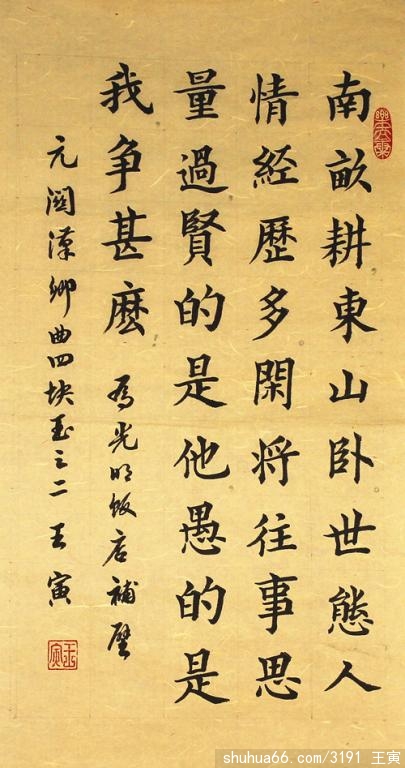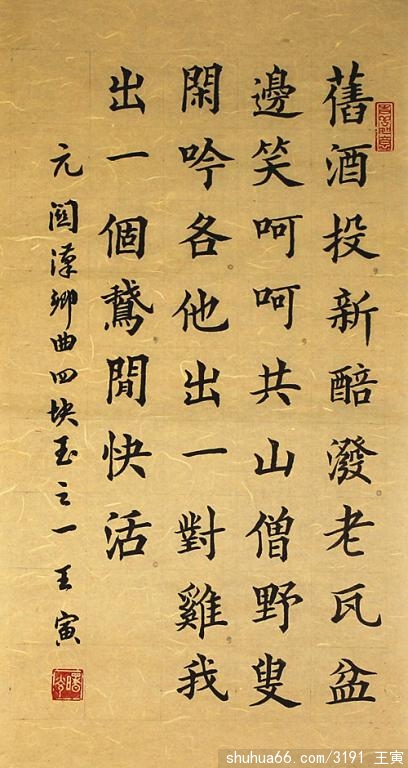 王寅,字曙光,号小童,笔名苦水,1942年9月生,安徽阜南县人,大专文化,一生从医,2003年退休。本人爱好书法、篆刻、绘画、诗词,现为中国书法家协会会员,中华诗词学会会员,北京华夏诗联书画院研究员,淮河书画院书画师、阜阳市诗词学会会员、阜南县诗词学会理事、《鸣岐诗坛》编辑,阜南县老年书画研究会副会长兼办公室副主任,书法、诗词入选多部书籍。