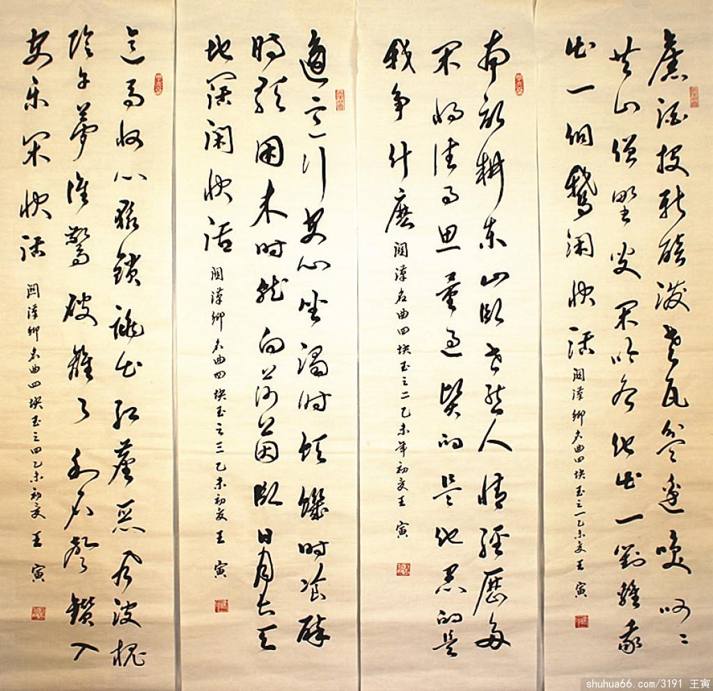 王寅对书法篆刻均有爱好,书法以真、行草、隶书为擅长,是一位不可多得的书写多种字的体实力派书法家。其书写风格特点:全羊毫长锋用笔,字体突出了继承与创新、柔中有刚、变化多姿、形态显神,以变求神的个性。楷书多取法颜真卿书圣,传统功力浑厚,结体端庄完美,师古而不泥;行草以孙过庭等历代大师为范,行草结合,刚柔兼容,飘逸清秀,气韵贯通,笔墨酣畅,苍劲古拙,典雅醇厚,自成风貌,自成一家,可谓一绝,耐人寻味。