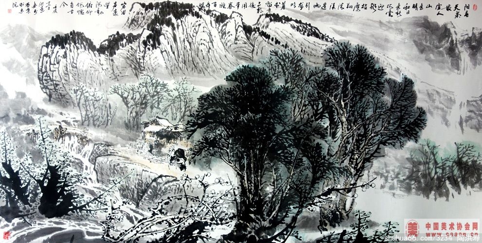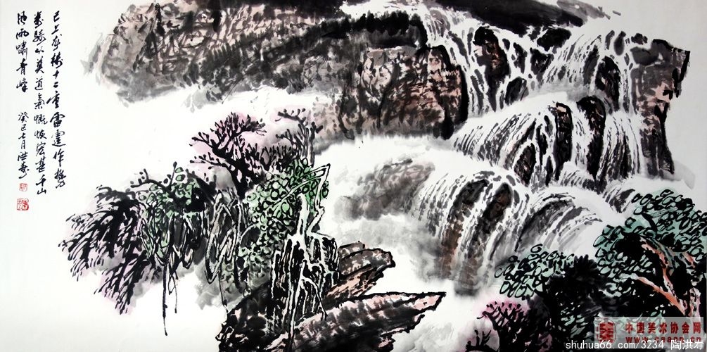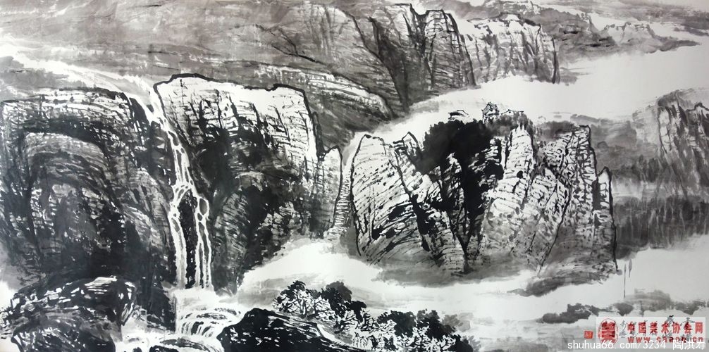 在陶老师的画笔下,精心裁剪的一脉山峰是他“仁者乐山”的载体。敏感的作者把握了山势巍峨的体貌,并赐予它人格化的精神。在神奇的造化里,山水是永恒的主题,它们静穆亿万年,目睹了岁月的轮回和世事沧桑,将万事万物的生存和毁灭融化在一片混沌里;它是人类生存的舞台,也是人类亘古的观众。而在陶先生的心中,山林丘壑是他无怨无悔创作的母题,他通过巍巍高山、茫茫大海、潺潺涓溪、苍苍树木告诉今人,造化再伟大,终究要“中得心源”,方可描绘出作者心中要呈现出来的苍茫的宇宙观、人生观、历史观。人类是自然之子,人类的生命摆脱不了宇宙的宏观规律,人类的悲欢离合正如山川的四季变化,画家心中的对时空不可逆转的悲怆和人类终极命运的宿命感使他会更加萌生“江山如此多娇”的感喟。势必会融入更多的情感于山水画中,情景交融的艺术境界也是水到渠成的了。