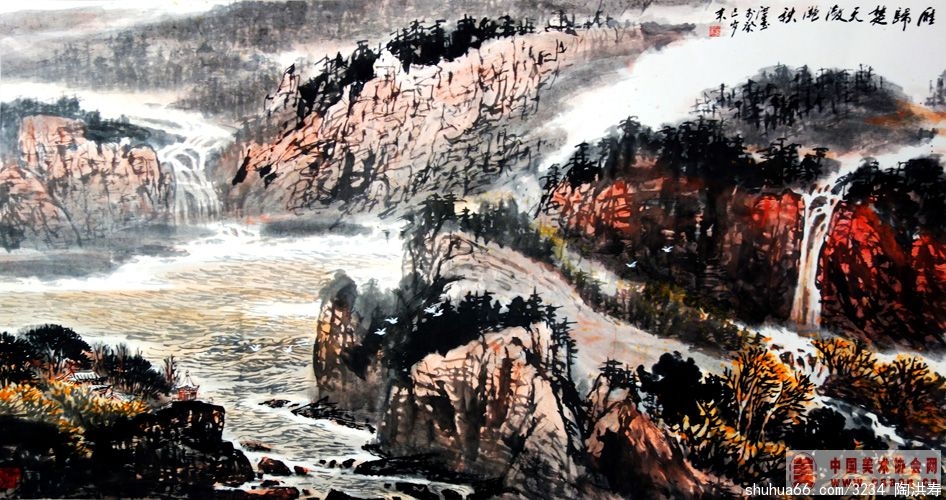 陶先生师从潘天寿大师,先师作品里的霸悍和雄强是当时画坛的一面猎猎大旗。几十年过去了,潘老的遗风被洪寿君吸收、消化、并成为他个人风格的一个鲜明特征,本刊只撷取其中的山水作品做简单评述,希望未来的日子里,陶先生的山水画会更具体审美意蕴,提供观者更多的思考和审美趣味。