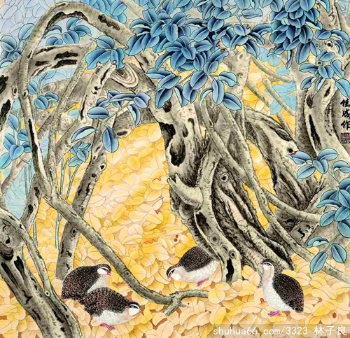 在艺术实践中,林子良先生还善于把民俗理念融入笔下,让画作尽量“画里有话,画外有音”,往往带有一定的祝福和吉祥寓意。近年来,他常用牡丹来象征富贵、雉鸡隐喻吉祥、锦鲤讴歌生活、孔雀赞誉人生,用荷、松、鹰、鹤言志,用梅、兰、竹、菊抒情。匠心的取材,巧妙的构思,也折射出了他深厚的文化底蕴。我想,或许正因其作品有着那么多的象征意义,且又有鸟语花香的明媚之境,有植物丰茂的繁荣之境,有绿荫融融、光影迷离的梦幻之境,才使得他的作品雅俗共赏,深受欢迎吧。而这些,我敢说也只有关爱生命、热爱自然、心有大爱、渴望创造的人,才能绘出如此美妙的精品佳作!