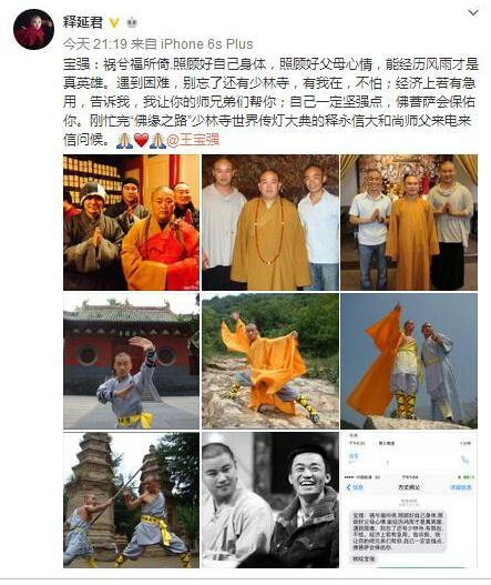 今天(8月16日),认证名为少林寺武僧徐鹏军,法名释延君,《少林寺传奇3》饰演大师兄的释延君发微博称,少林寺方丈释永信发短信给释延君,请他转给王宝强。短信内容希望宝强照顾好自己身体和父母心情,并称“若经济上有急用,告诉我,我让你的师兄们帮你”。>>知情人:王宝强账户余额只剩十几万 其余遭转移