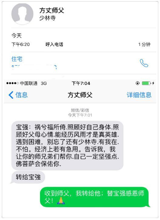 宝强:祸兮福所倚.照顾好自己身体,照顾好父母心情,能经历风雨才是真英雄。遇到困难,别忘了还有少林寺,有我在,不怕;经济上若有急用,告诉我,我让你的师兄弟们帮你;自己一定坚强点,佛菩萨会保佑你。刚忙完“佛缘之路”少林寺世界传灯大典的释永信大和尚师父来电来信问候。@王宝强