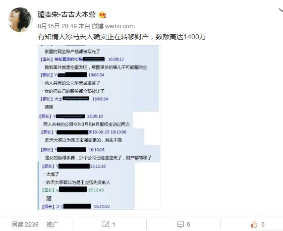 第四,财产现状。这几天连续爆出多个有关财产的消息。包括这条微博中提到的转移财产。有朋友说,看见王宝强和助理拿着身份证一个个到银行里,问有没有自己的银行卡,那面容憔悴异常。可见,平时王宝强完全把财产交给马蓉处理,自己几乎完全信任对方。所以才会把公司的法人以及房子的房主,还有很多产权人,把马蓉的名字写上。一个男人如果把财产都交给一个女人的时候,请这个女人一定不要伤害他。