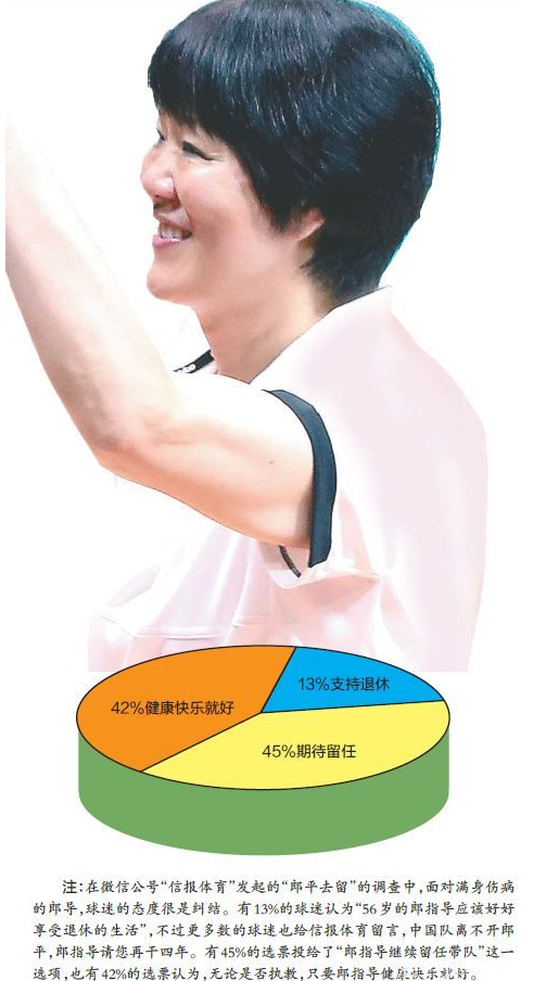 为了平衡身体的伤痛,56岁的郎平还要进行肌肉训练。对于这些,喜爱郎平的球迷看在眼里,疼在心里。在微信公号“信报体育”发起的调查中,有13%的球迷认为“56岁的郎指导应该好好享受退休的生活”,不过更多数的球迷也给信报体育留言,中国队离不开郎平,郎指导请您再干四年。有45%的选票投给了“郎指导继续留任带队”这一选项,也有42%的选票认为,无论是否执教,只要郎指导健康快乐就好。