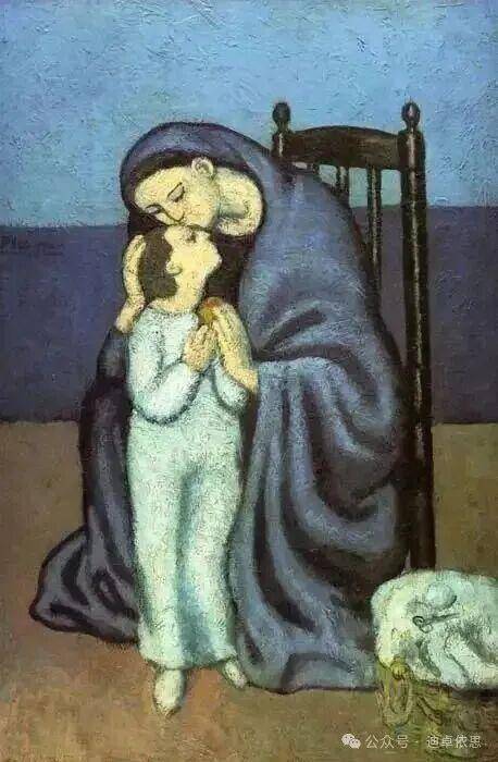 “蓝色时期”的作品,如《老吉他手》(The Old Guitarist, 1903)、《生命》(La Vie, 1903),以冷峻的蓝色调描绘贫困、孤独、疾病与死亡。这些画作中的形象多为流浪者、盲人、妓女与孤儿,他们的身体被拉长、扭曲,姿态低垂,眼神空洞,传达出深刻的绝望与无力感。毕加索并未以旁观者的姿态进行社会批判,而是以共情的方式将自己融入这些边缘人物的生命体验中。这种表达方式超越了写实主义的客观再现,进入存在主义式的“本真”领域——即直面生命的荒诞、苦难与有限性。正如海德格尔所言,“本真”意味着对“向死而生”的清醒认知,而毕加索在蓝色时期的作品,正是对这一生命境况的视觉呈现。