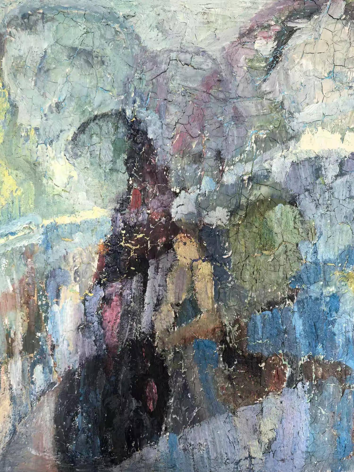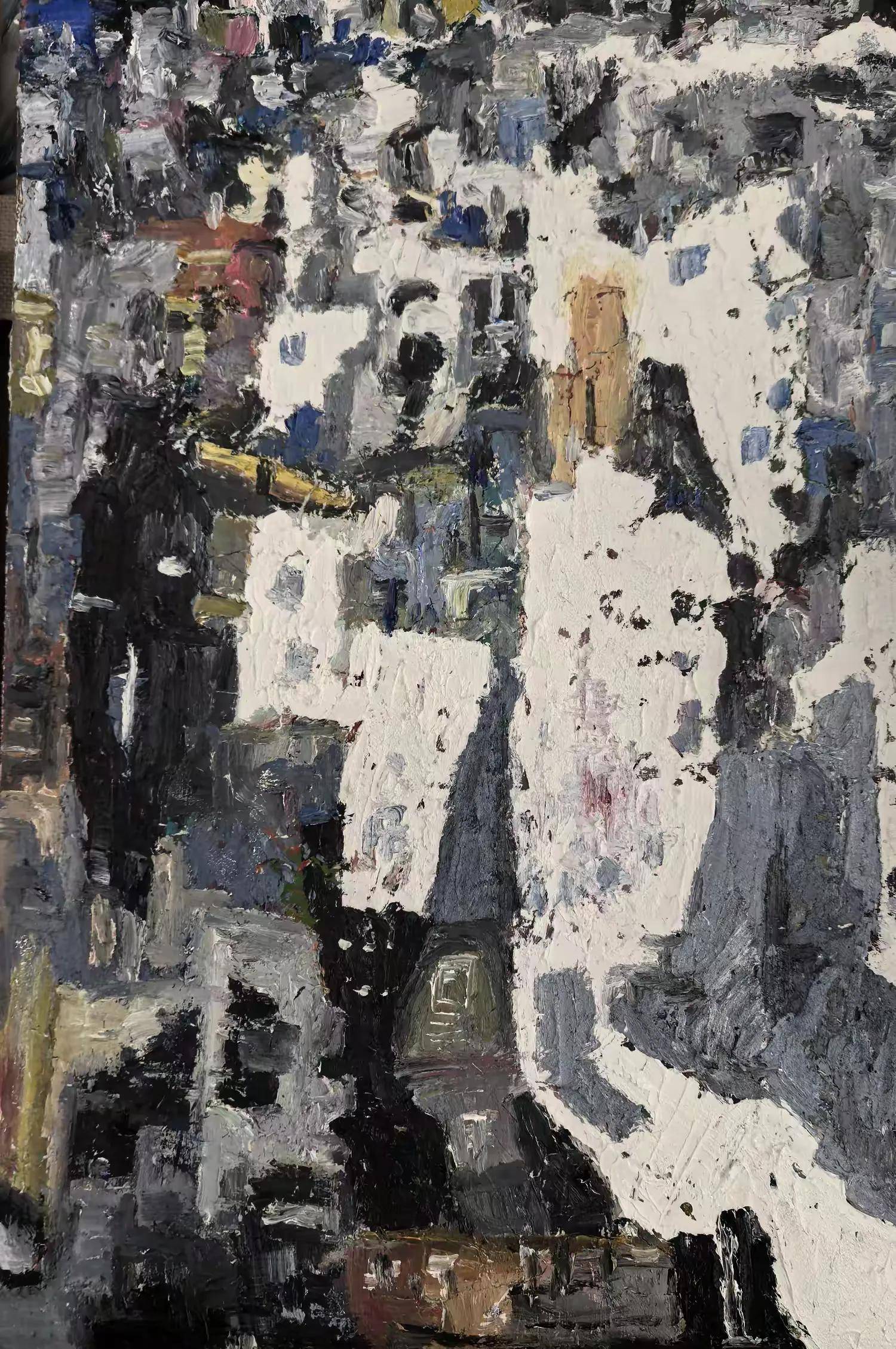 《小镇》被解重构为色域体系,通过平面化处理消解空间深度,使画面成为承载集体记忆的场域。由形达意,他的作品在写意阶段的创作呈现出明显的东方美学特质,比如马的动态捕捉不再依赖于解剖学准确性,而是通过笔势的流动性传递生命的韵律。又如在《秦俑》中,陈利军以形达意,深刻表达历史符号的物质属性,使陶俑形象转化为文明记忆的图腾。这种创作策略暗合中国传统文人画"迁想妙得"的美学理念,同时兼具现代艺术中的符号学理论。画面中偶发性的笔触失控与色彩漫溢,实则是陈利军对"可控性"创作观念的反叛,这种创作状态使作品获得了超越技术层面的精神维度。从《花旦》到《佛像》陈利军逐步建立起独特的从写实到写意的视觉语法体系,在人物造型中鲜明严谨的结构已经递进为丰富的文化、历史、情感、思想视觉密码,这种油画创作手法增益了东方美学的写意精神,兼融当代艺术的观念性表达,内涵丰富,相当耐于品读。
