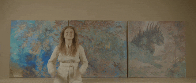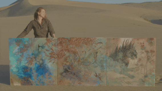她不仅深入洞窟内部,感受壁画的古老力量,更走进敦煌研究院美术研究所,聆听艺术家们保护和传承敦煌艺术的动人故事 。而历久弥新的敦煌文化,也将她的想象彻底放飞。她将内心的感受在指尖凝结成伟大的作品,还尝试用中国毛笔、敦煌矿物颜料进行创作。敦煌山脉的光影流转、细沙划过画纸的自然纹理,都化作她笔下最鲜活的灵感。