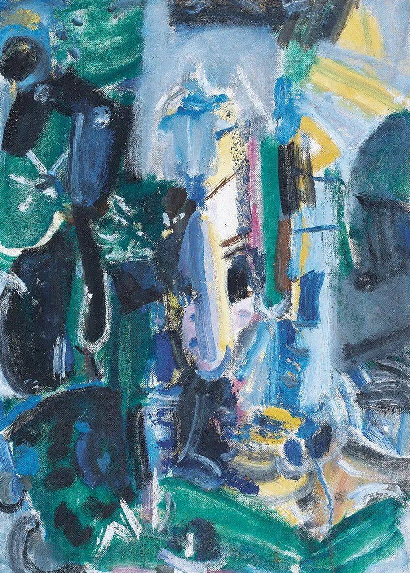 《朵韵》以自在挥洒的笔触呈现吴先生80年代最经典的色调与画面结构,朝气蓬勃、气质独特。触目引人的便是其精湛的色彩表现,色域广阔,呈由亮到暗、从暖至冷过渡。右半明亮,以藤黄、洋红等色构出城镇街巷,显层叠空间;左半暗冷,普蓝、深绿等色作浓荫,缀粉白花朵,长线条延绿意成绿坡。深蓝浓绿平衡右半轻盈,画面收放有致,有视觉起伏与勃勃生机。